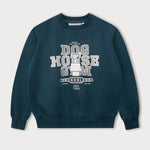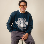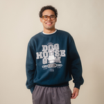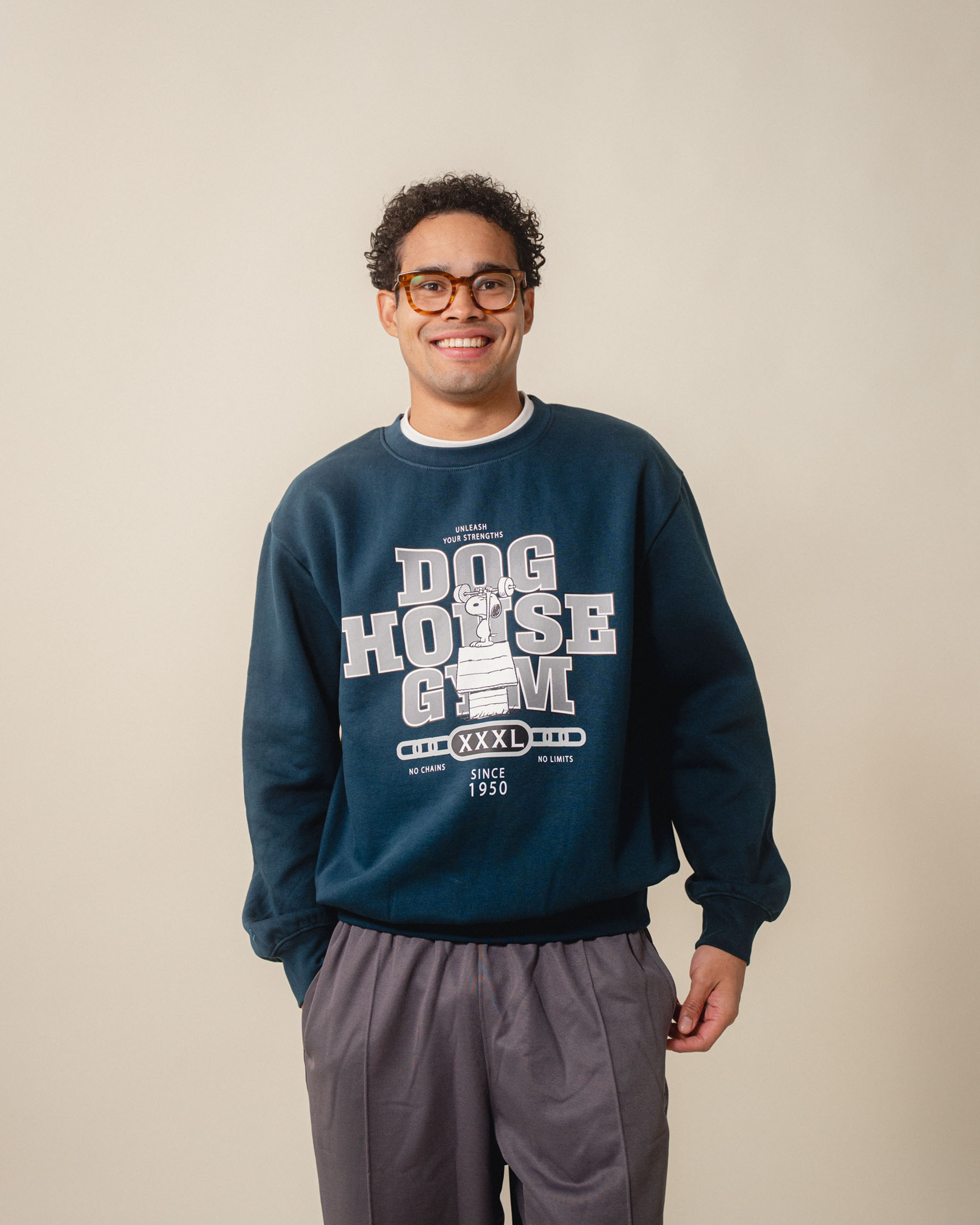 Der großflächige Frontprint des navyfarbenen Sweaters zeigt Snoopy, wie er hochkonzentriert mit einer Hantel trainiert, umrahmt vom plakativen „DOG HOUSE GYM“ Schriftzug.